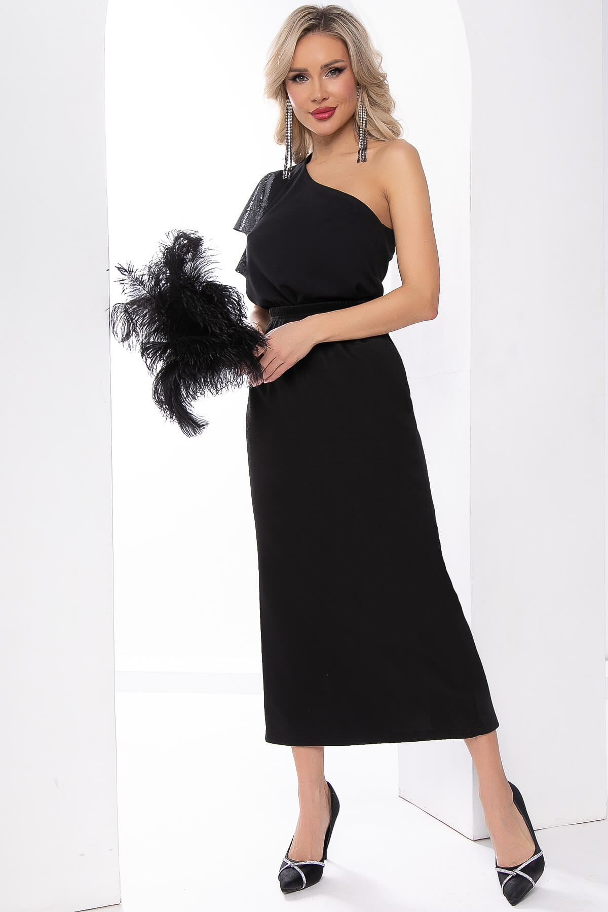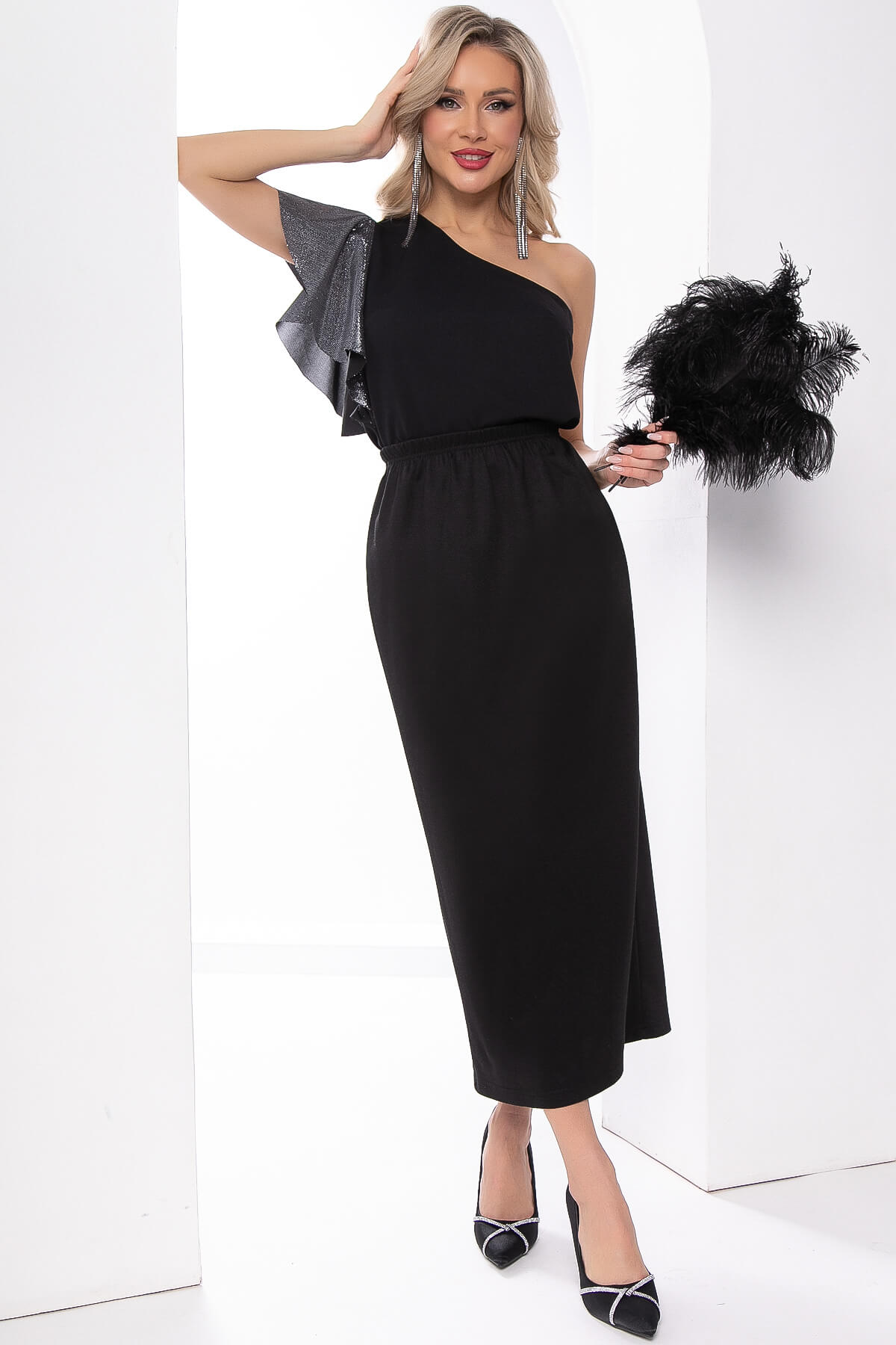 Прекрасный выбор! Черный топ на одно плечо с рукавом-воланом - стильный и элегантный элемент гардероба. Создайте невероятные образы, сочетая его с разнообразными брюками, юбками или джинсами.