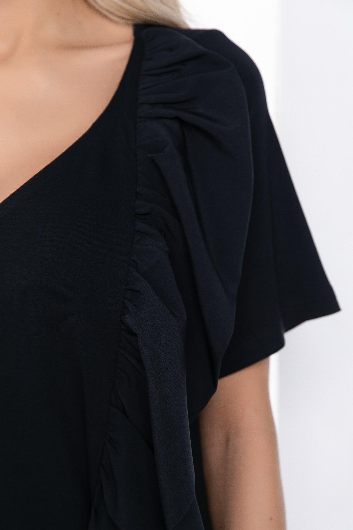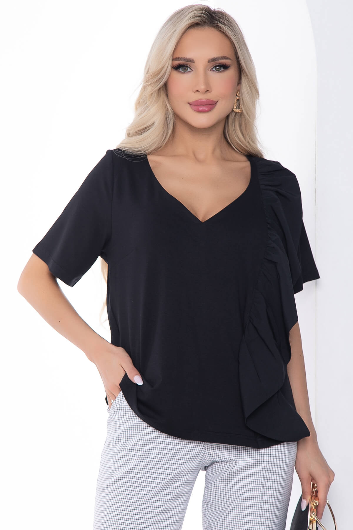 Женская блузка среднего объема с воланом по переду полуприлегающего силуэта, V-образный вырез горловины переда, короткий втачной рукав. Без подклада.