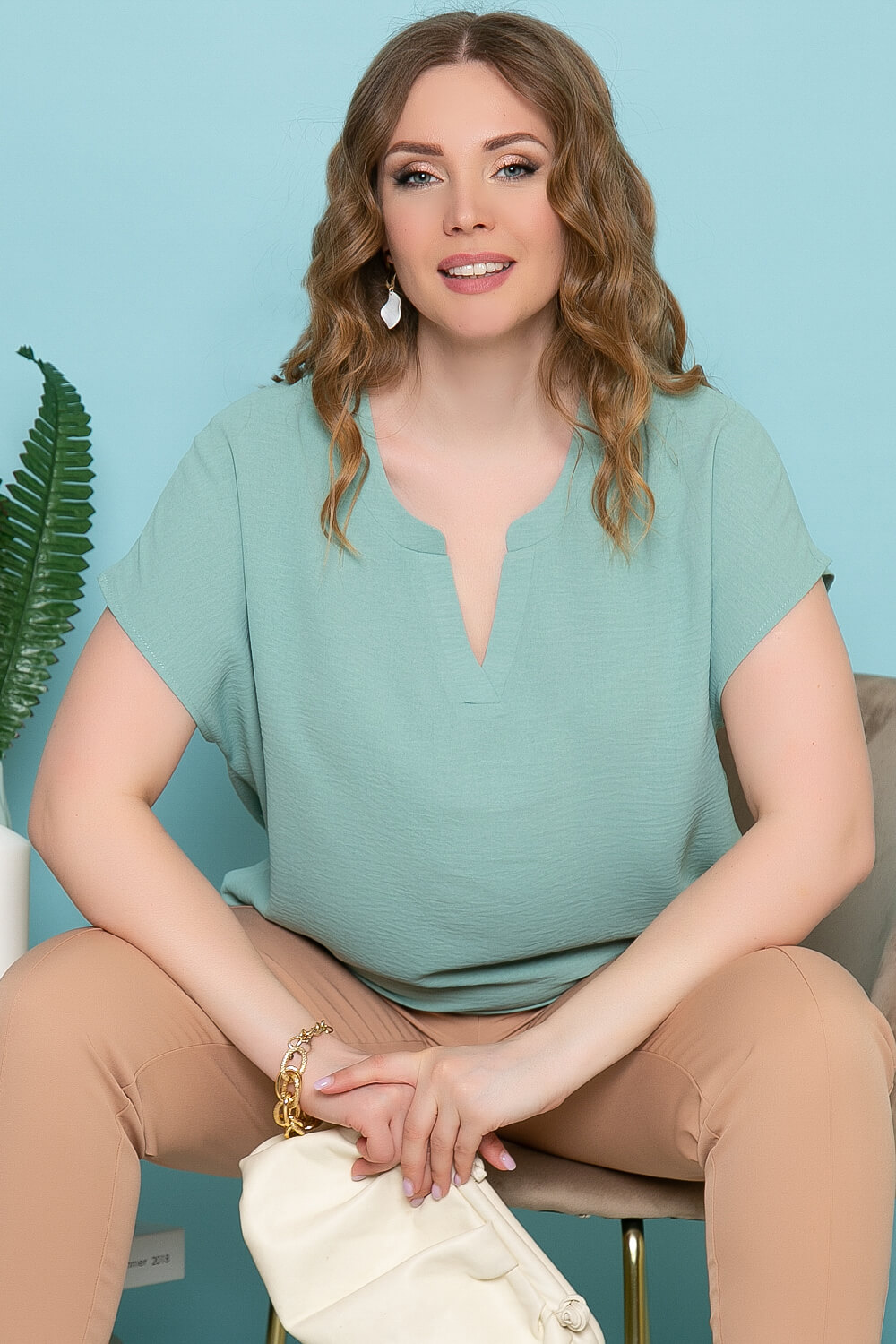 Элегантная лёгкая блуза с коротким рукавом для создания элегантных летних образов. Блуза свободного кроя, рукав цельнокроенный. Мягкий, округлый вырез горловины дополнен V-образным разрезом. Прекрасно будет сочетаться с классическими брюками или юбкой.
