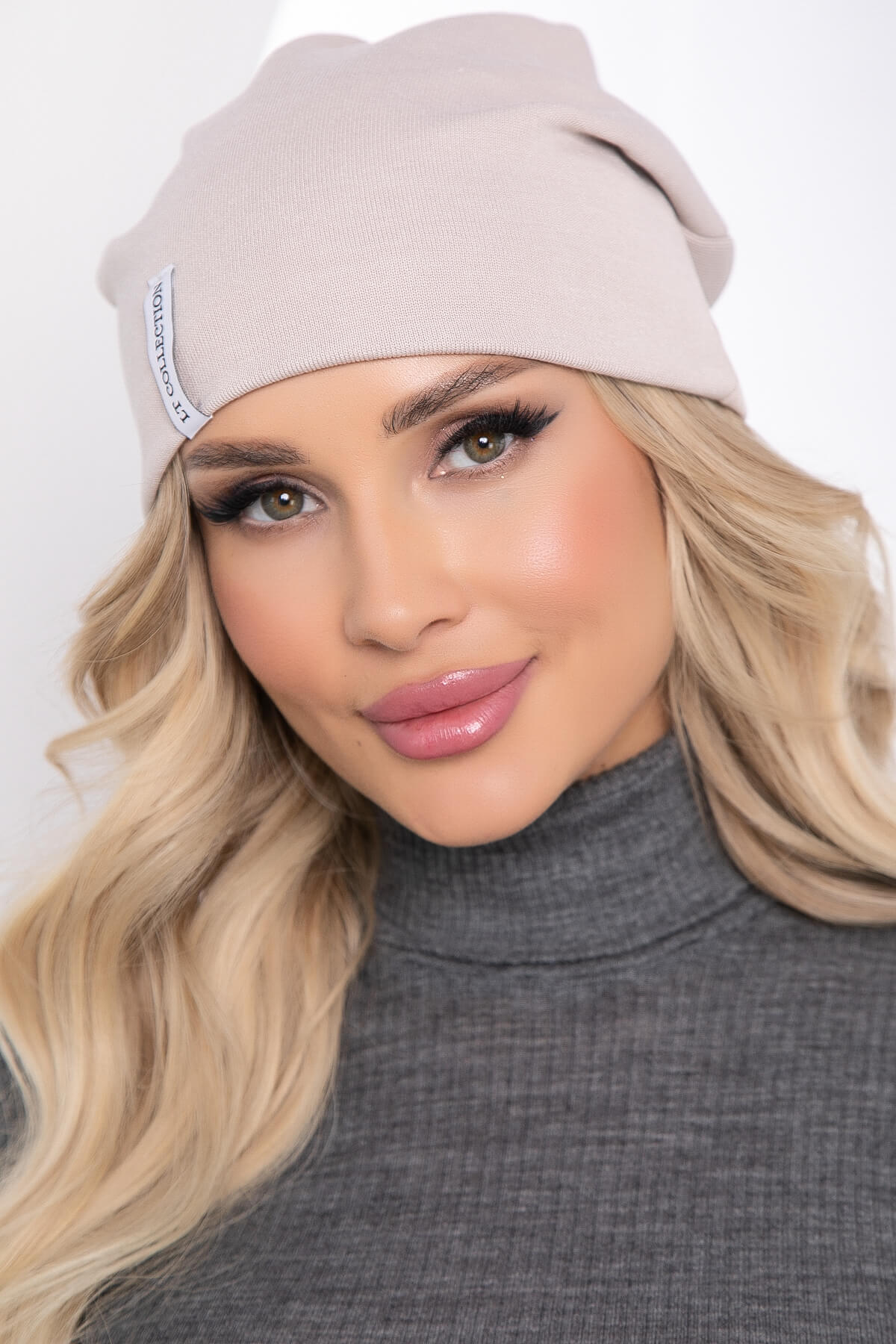 Брендовая шапка LT Collection из трикотажа нежного бежевого цвета. Шапка имеет универсальную форму, состоит из 6-ти клиньев и подходит для любой формы лица. Можно носить с отгибкой и без.