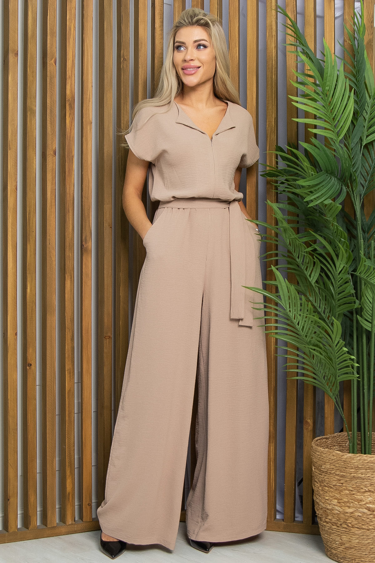 Универсальный и стильный комбинезон, выполненный в современном дизайне, станет отличным дополнением вашего летнего гардероба! Талия комбинезона на резинке, плечо спущенное, а на груди потайная молния. Брюки свободного кроя длиной в пол создадут эффектный силуэт и обеспечат свободу движений, добавляя образу лёгкости и изящества. В комплекте идёт пояс из основной ткани, который подчеркнёт вашу талию и разнообразит стиль. Вы можете сочетать этот комбинезон как с каблуками, создавая утончённый образ, так и с кроссовками для более повседневного стиля.