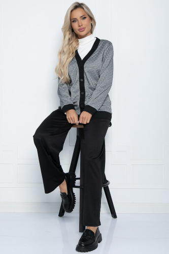Костюм-двойка, состоящий из классических брюк прямого кроя и свободного жакета с трендовым принтом. Брюки на молнии спереди, сзади талия на резинке, в боковых швах есть карманы. В таком трикотажном костюме можно смело отправиться на прогулку или на встречу с друзьями. Целый день вам будет уютно и комфортно.