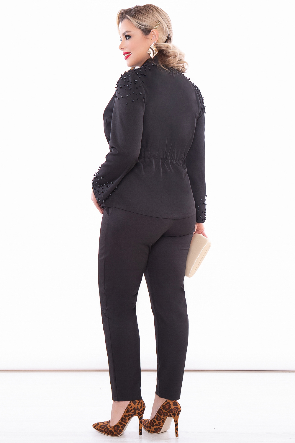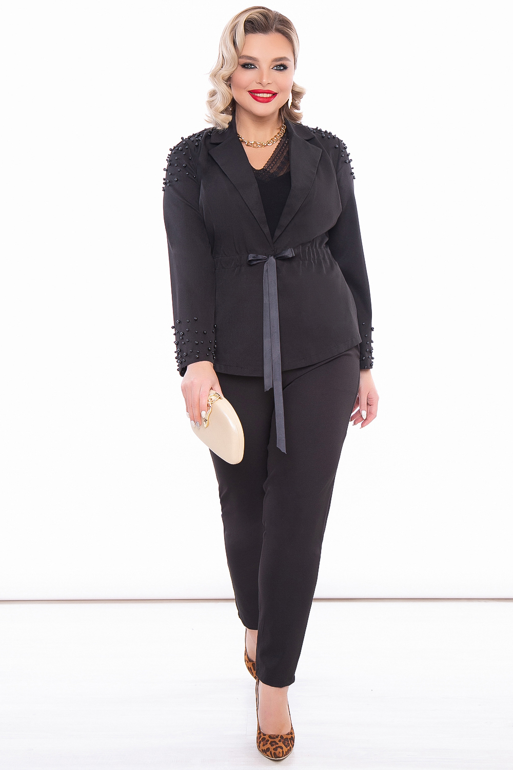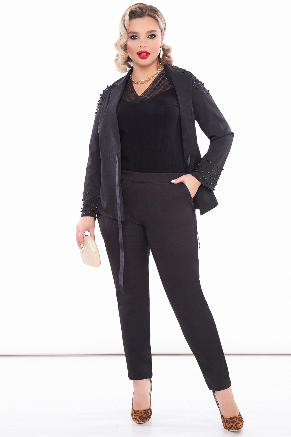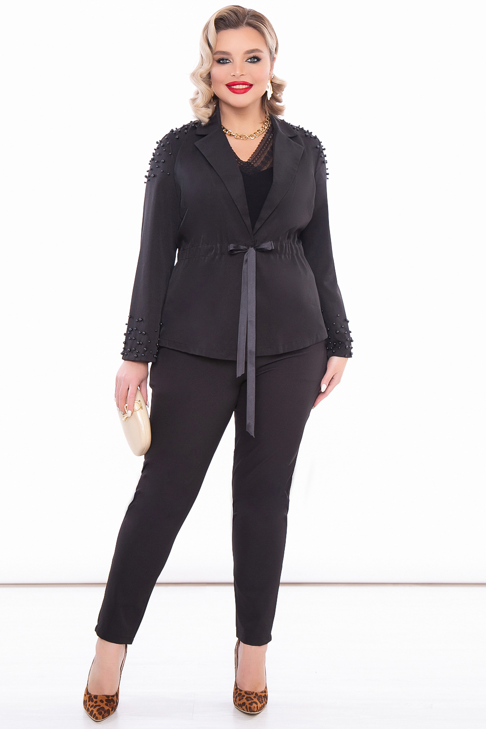 Роскошный брючный костюм классического чёрного цвета. Строгий и изысканный. Образ не нуждается в дополнительных акцентах, так как пиджак декорирован красивыми жемчужными бусинами.