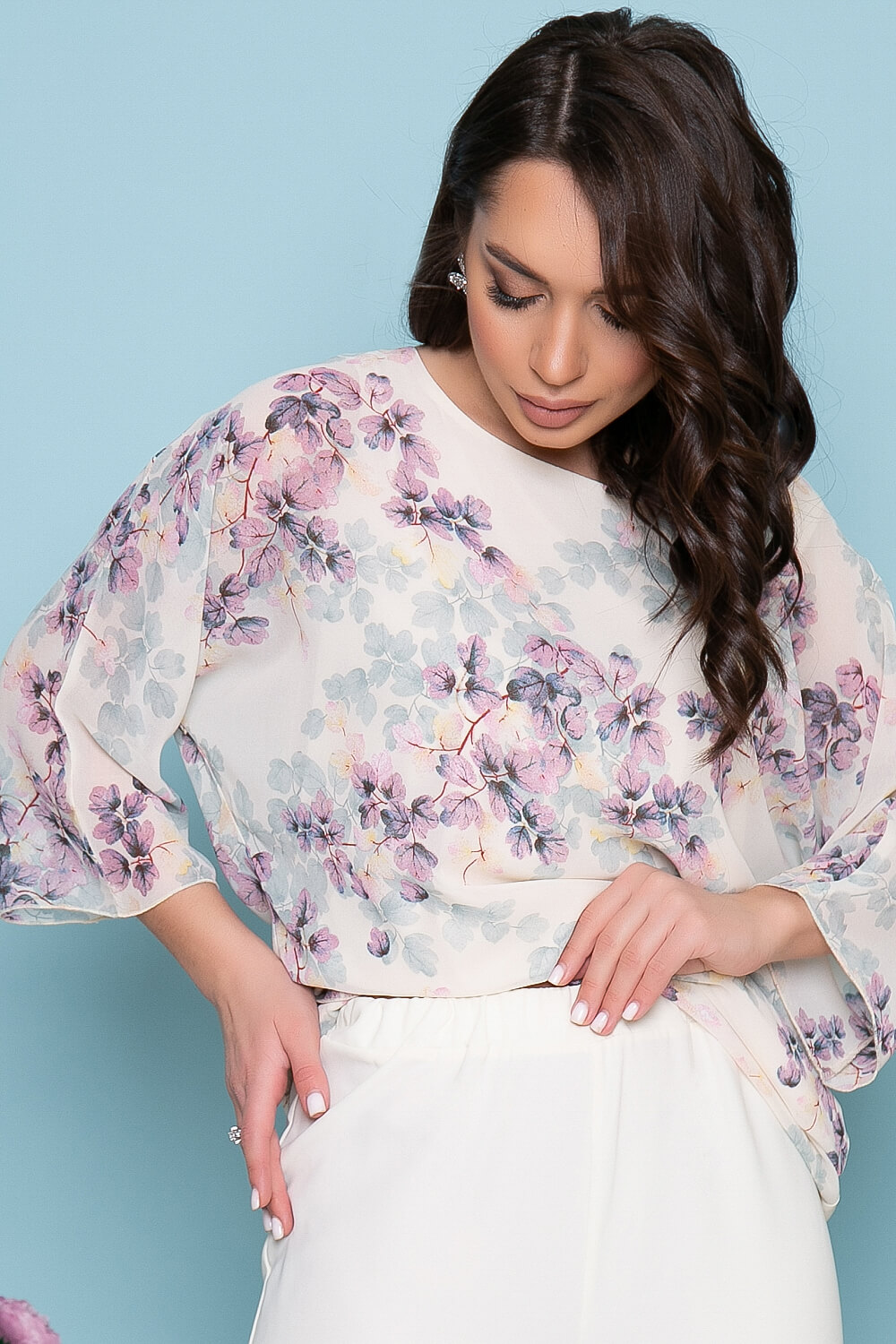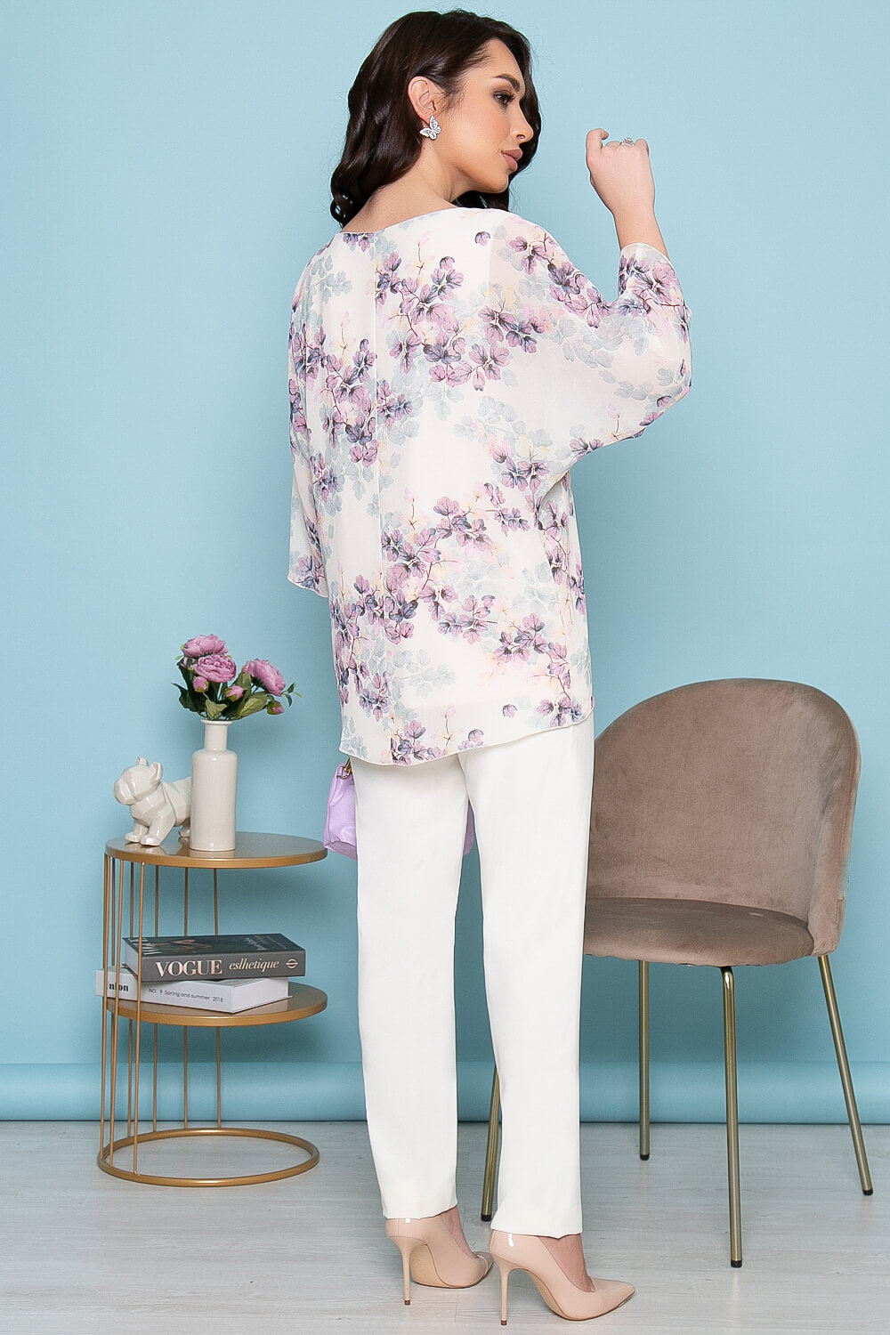 Очаровательный костюм из двух предметов: прямых брючек и блузы. Блуза свободного кроя на подкладке. Мягкий, округлый вырез горловины, рукав цельнокроенный, три четверти. Брюки на резинке.