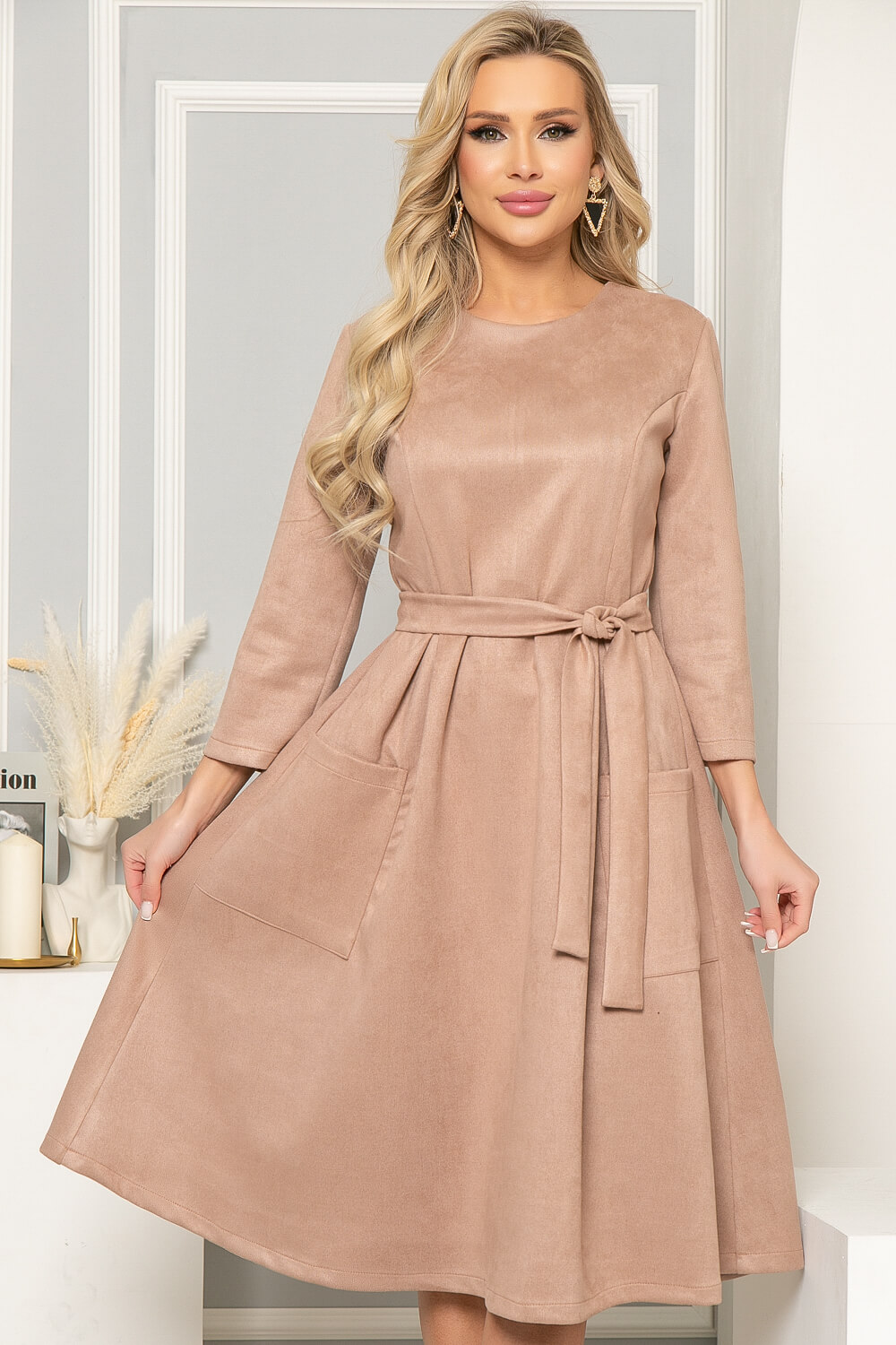 Платье из экозамши станет прекрасным вариантом на каждый день. Наряд из замши приятен к телу и наощупь. Платья из замшевой ткани можно носить в любое время года, они пользуются спросом среди женщин всех возрастов. Оттенок платья позволяет создавать множество интересных цветовых сочетаний. Вырез горловины - округлый. Втачной рукав три четверти. В комплект входит пояс из основной ткани. Платье без подкладки.
