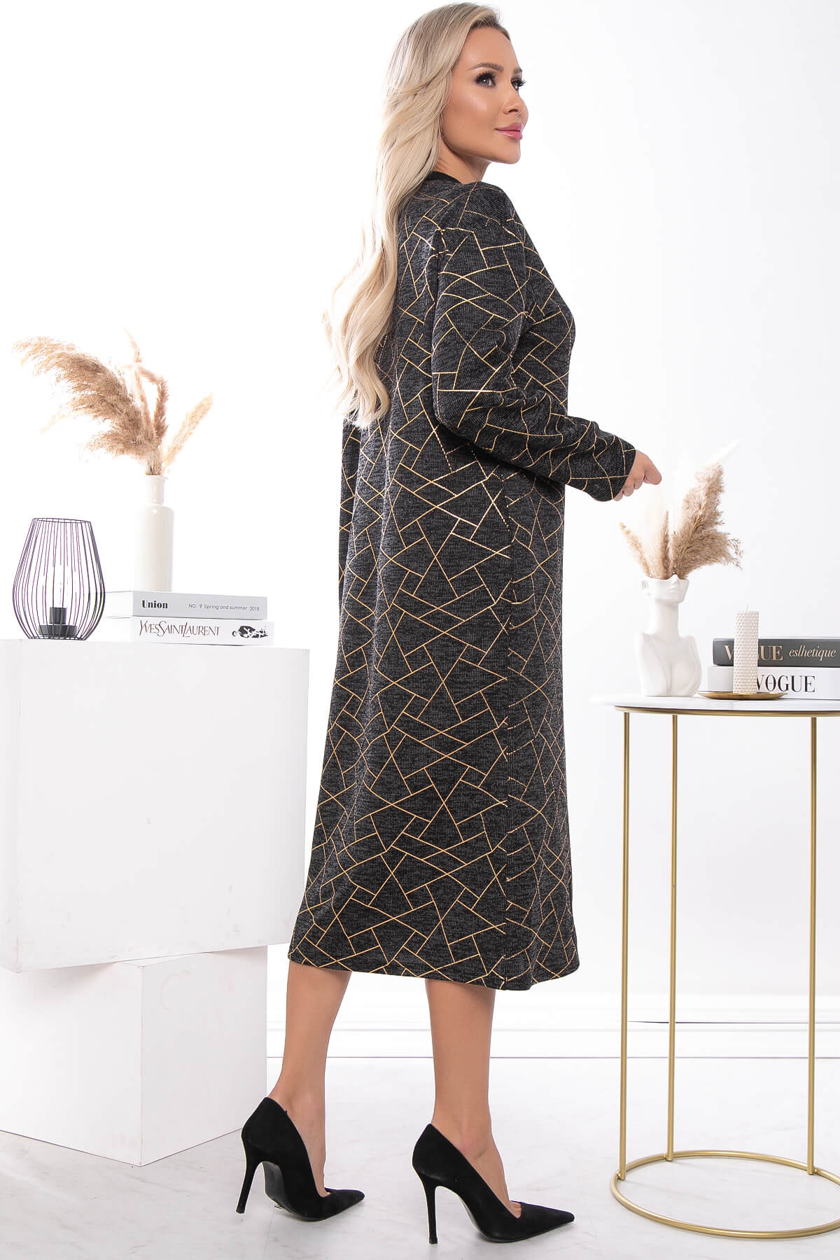 Платье для комфортного повседневного образа. Такие вещи очень универсальны и всегда выручают в ситуации, когда не знаешь, что надеть. Платье прямого кроя свободного силуэта. Рукава длинные со спущенным плечевым швом. Изделие украшает принт с вставками золотого цвета. В боковых швах есть карманы.