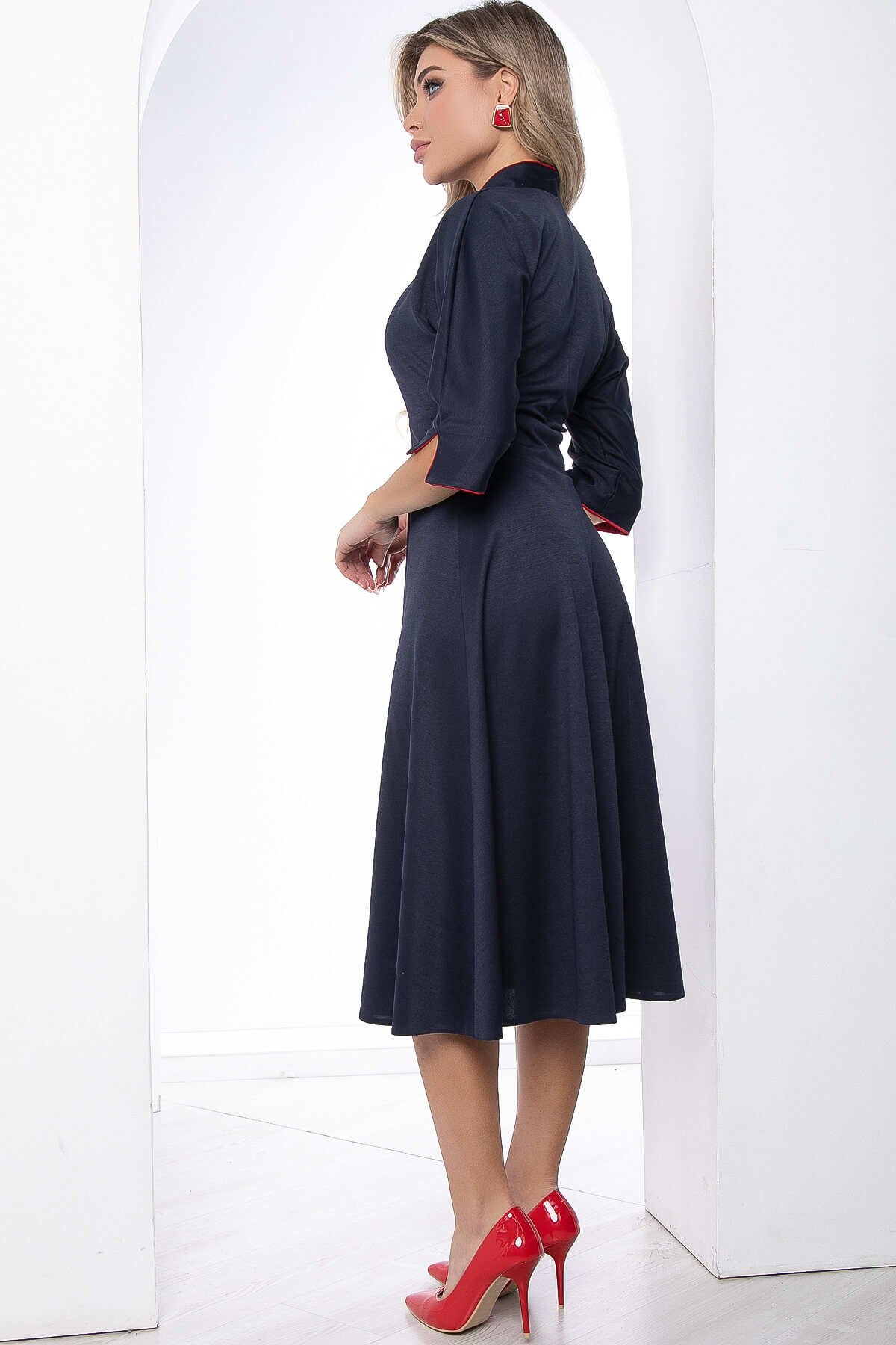 Платье - экспрессия! Элегантное сочетание тёмно-синего и красного цветов подчеркнут вашу индивидуальность. Крой юбки - полусолнце. По центру юбки встречная складка красного цвета. Рукава цельнокроеные, три четверти, с манжетами с разрезами на красной обтачке. Воротник стойка также выполнен с обтачкой красного цвета.