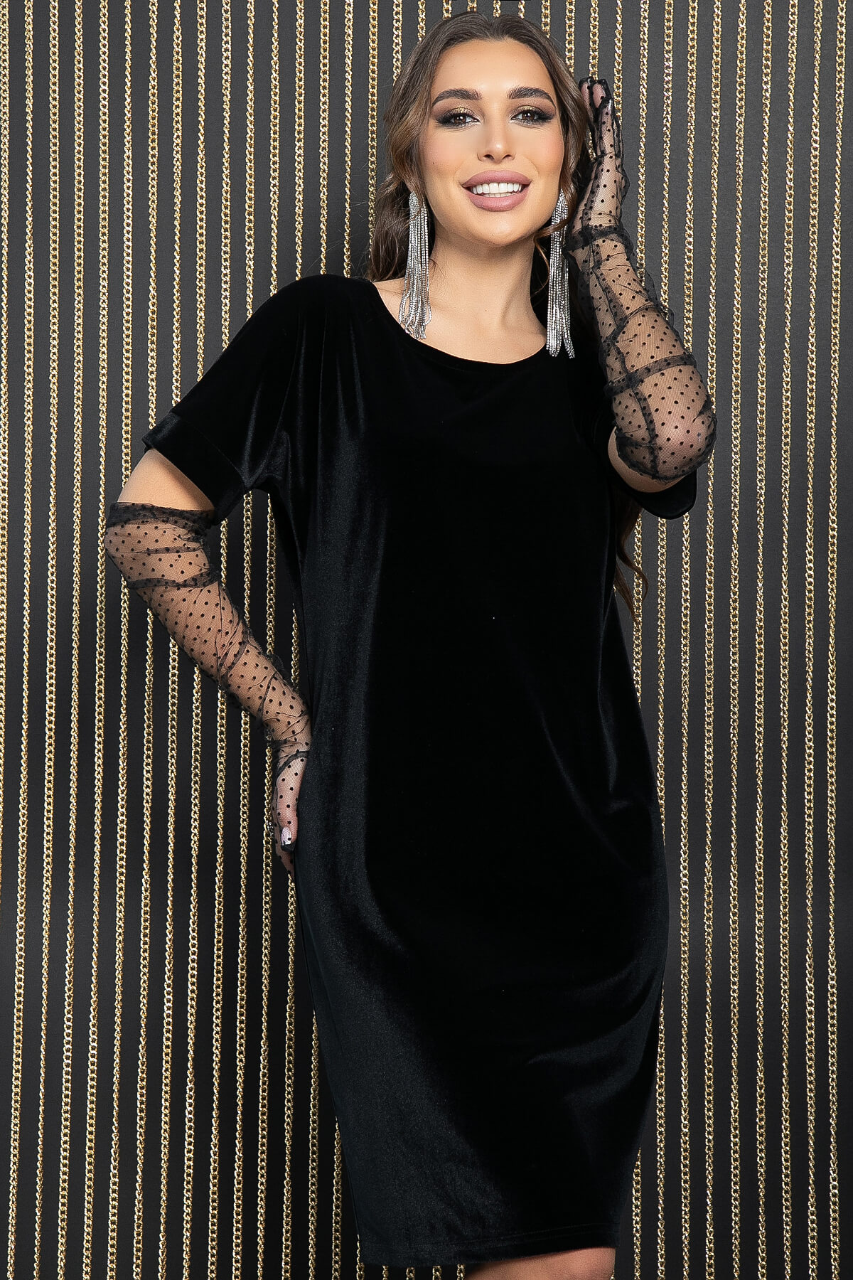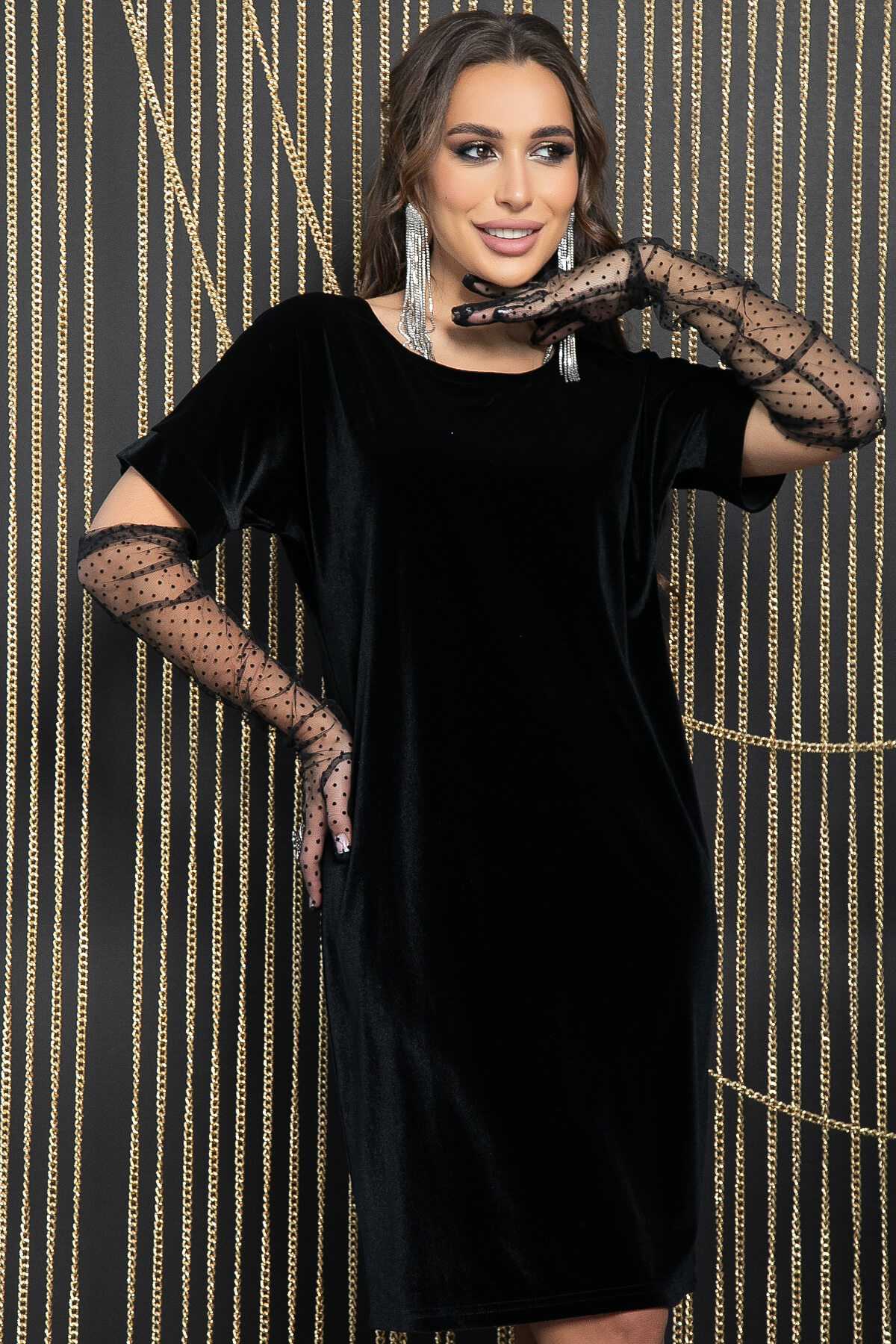Почувствуйте себя королевой в этом платье! По спинке выполнен декоративный вырез, акцентирующий внимание на вашем образе. Рукав цельнокроеный короткий с манжетой по низу подходит абсолютно для любого типа и телосложения фигуры и скрывает недостатки.