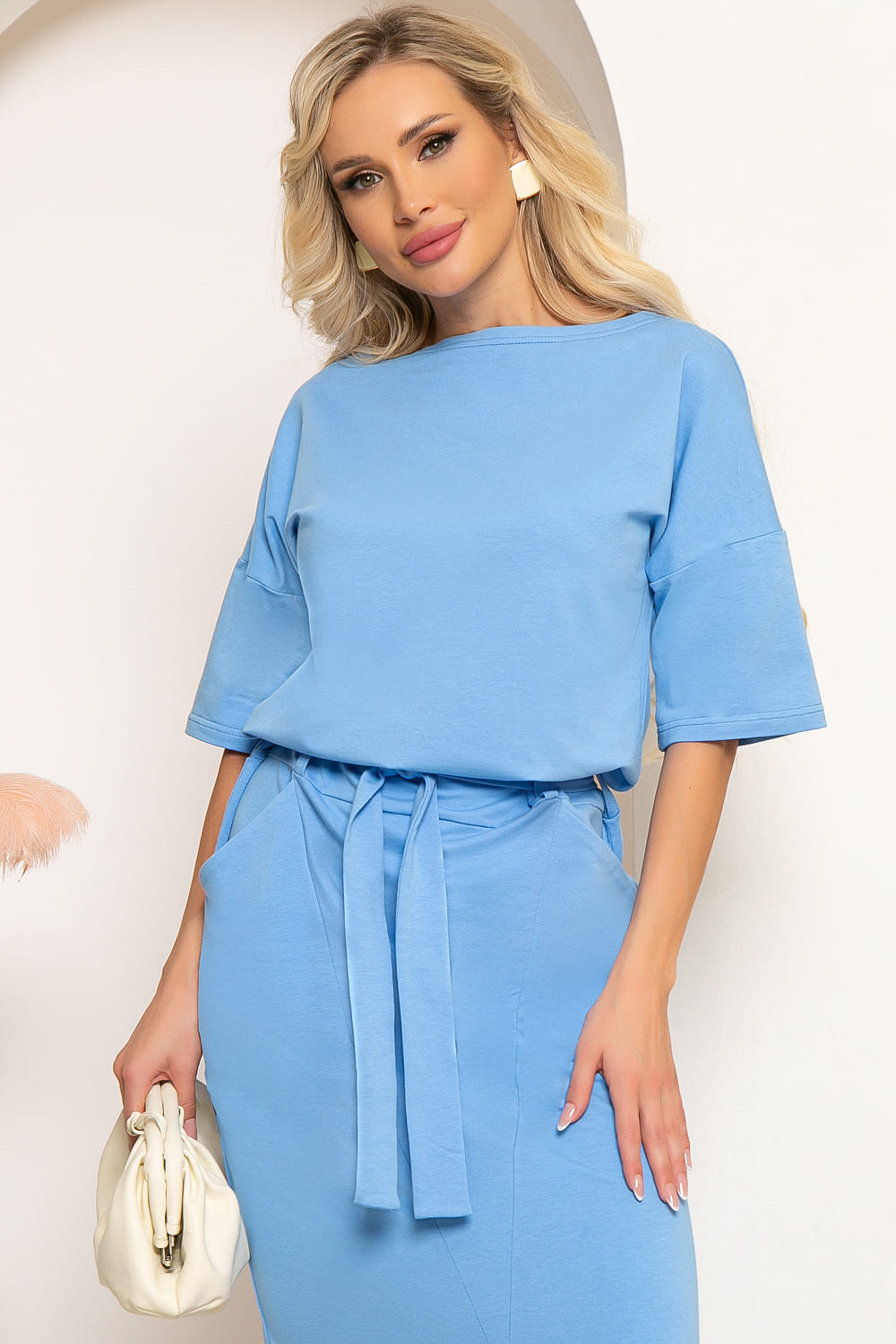 Трикотажное платье длины макси в красивом светло-голубом оттенке. Универсальное платье, которое дополнит ваш повседневный гардероб. Отлично смотрится как с туфлями на каблуке, так и с кедами или кроссовками. Платье прекрасно подойдёт женщинам в ожидании малыша, ведь его крой позволяет комфортно разместить животик. Платье прямого кроя с акцентным разрезом по переду юбки. Рукав втачной, линия плеча спущена. Платье можно завязать поясом, подчеркнув талию, или носить расслаблено в стиле оверсайз. Пояс из основной ткани входит в комплект. Платье оснащено шлёвками. Есть карманы.