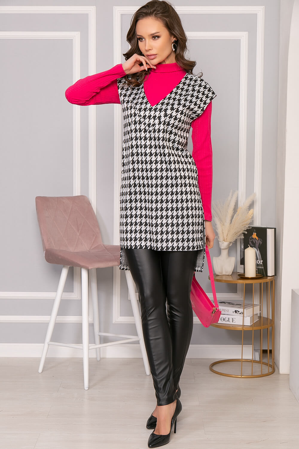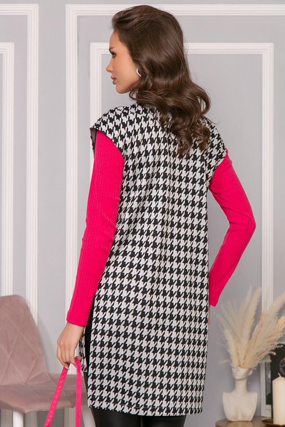 Удлинённый жилет с классическим принтом "Гусиная лапка" - абсолютно универсальная вещь. С ним можно надеть брюки любого кроя, джинсы, шорты, юбки и платья, водолазки, рубашки. С его помощью визуально вытягивается силуэт, придавая фигуре утонченность. В комплект входит пояс из основной ткани с металлической пряжкой-полукольцами. По бокам есть разрезы. Спинка удлинена.