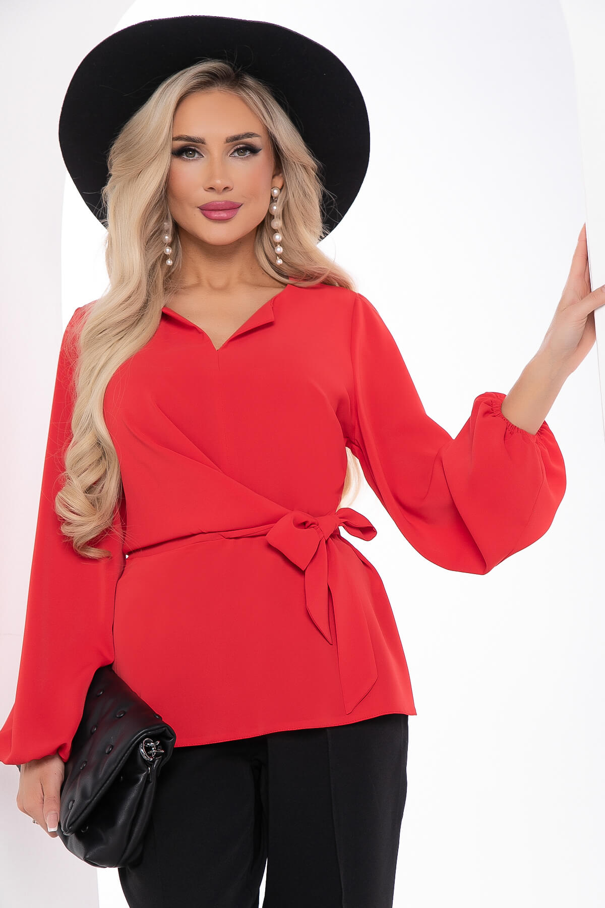 Блуза свободного силуэта, выполненная из приятной к телу ткани в ярком цвете, который хорошо будет сочетаться с Вашим гардеробом. Рукав втачной, длинный, низ рукава на резинке. При помощи такой блузы Вы с лёгкостью сможете украсить свой офисный образ. Вырез округлый с акцентным разрезом. Особый шарм придает втачной пояс.