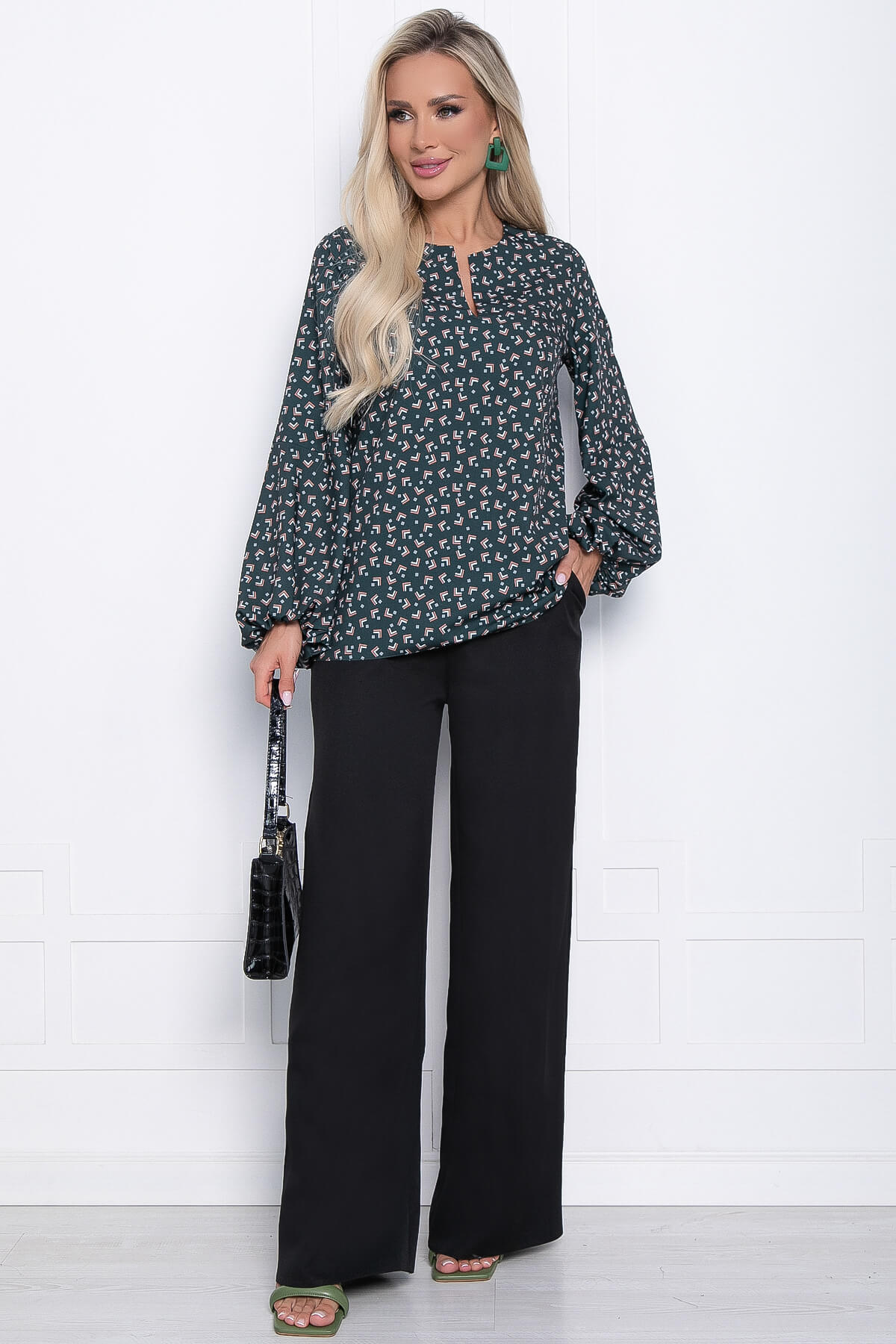 Блузка с геометрическим принтом - прекрасный выбор для стильных офисных образов! Отлично сочетается с юбками и брюками. Свободный крой позволяет с лёгкостью скрыть недостатки фигуры. Низ рукавов на резинке.