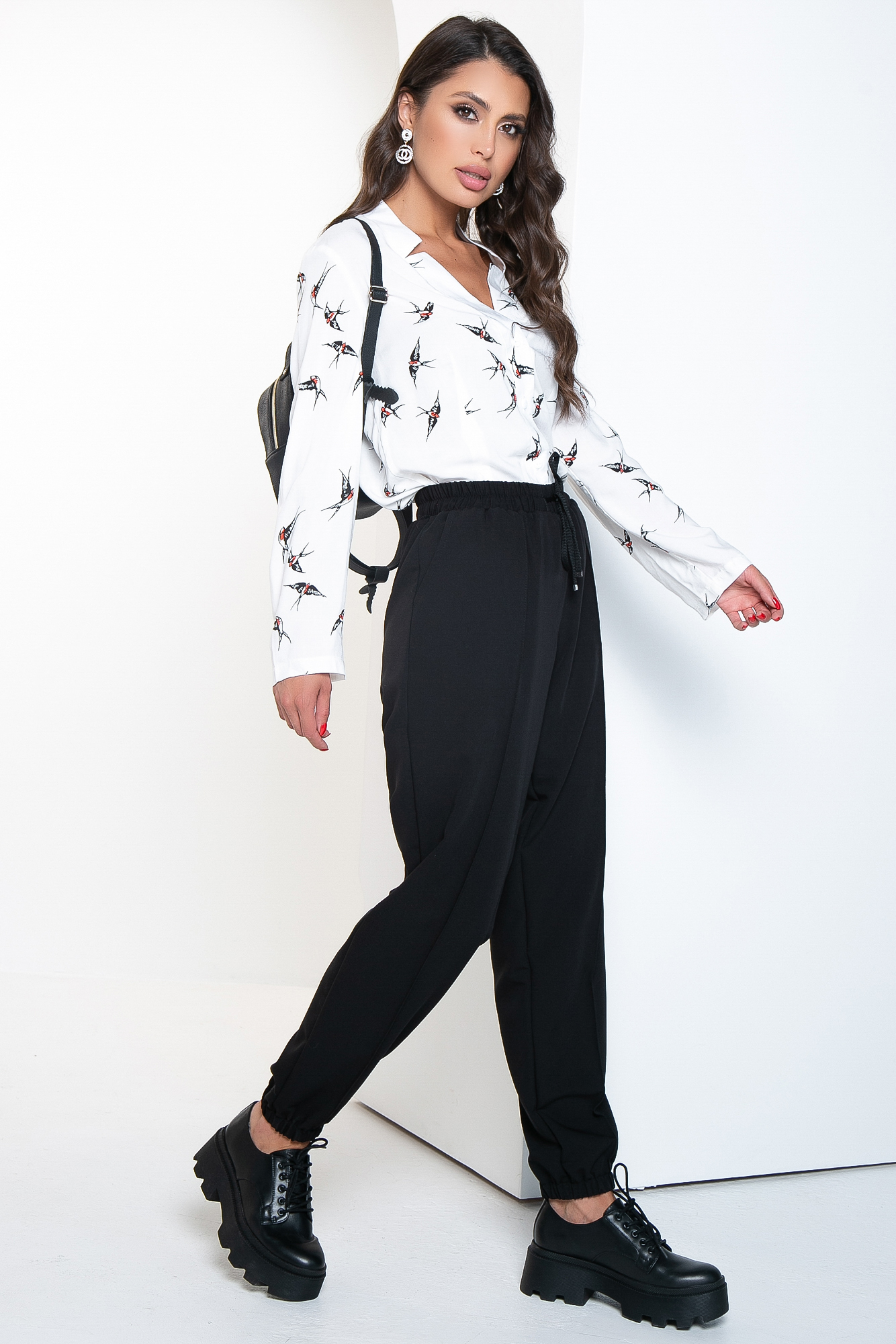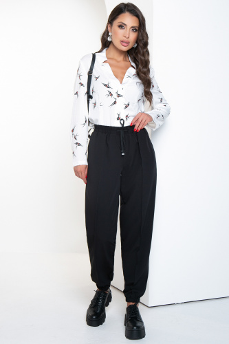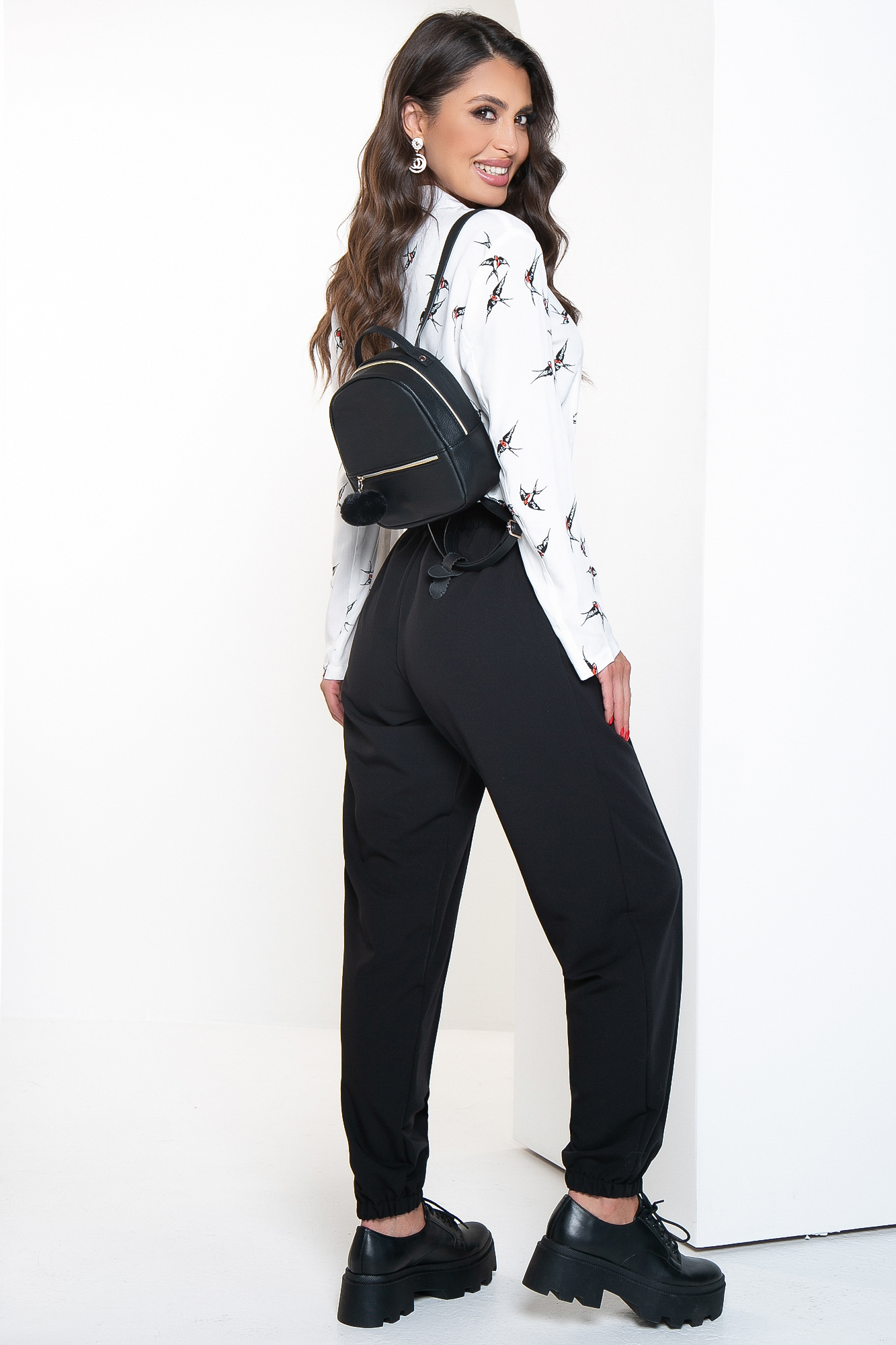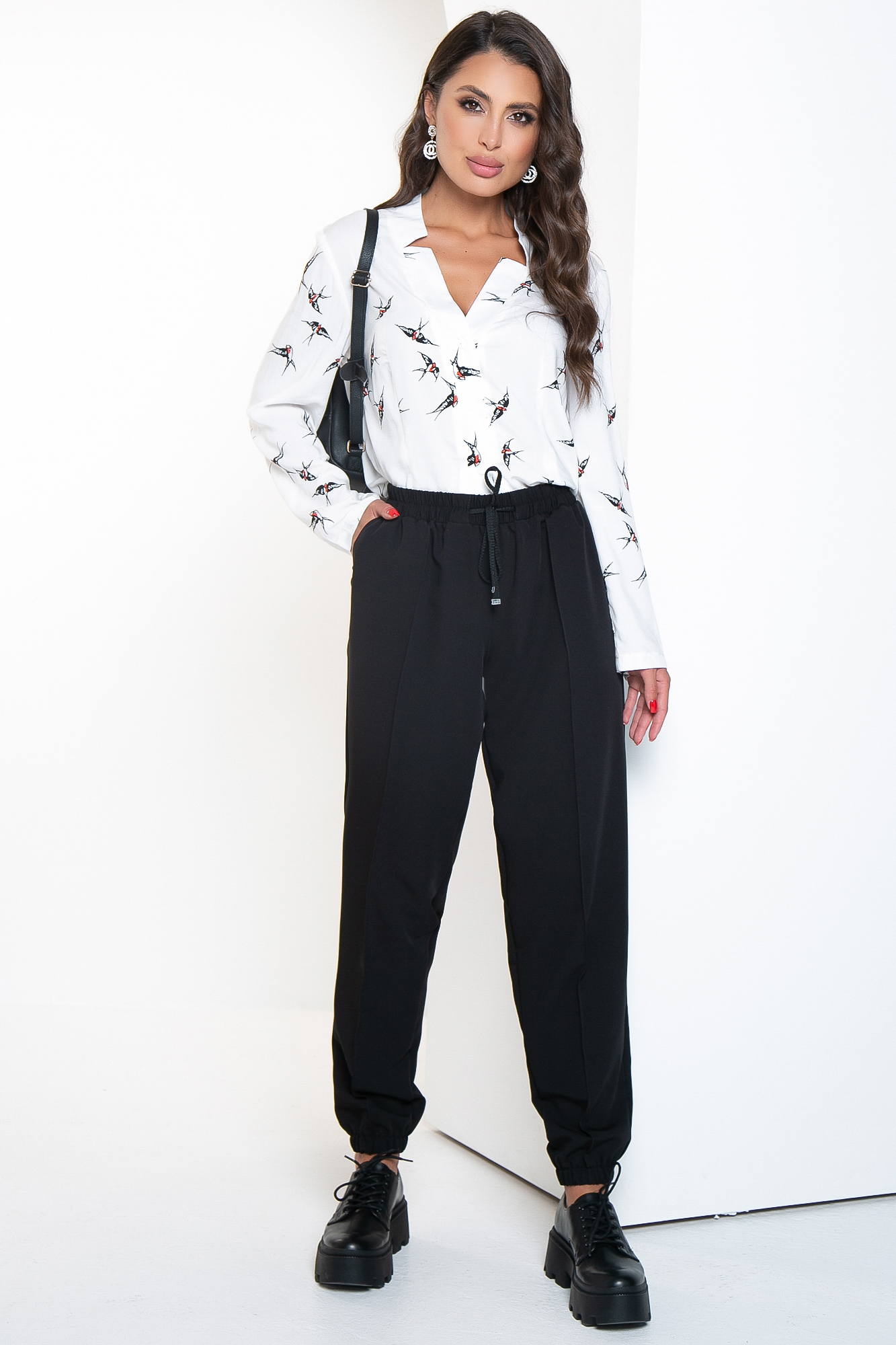 Джоггеры в стиле кэжуал - популярный тренд 2021 года! Чёрные джоггеры со стрелками идеально впишутся в Ваш офисный гардероб, стоит лишь использовать в качестве верха блузу или рубашку. Отсроченные стрелки визуально удлинят Ваши ножки!