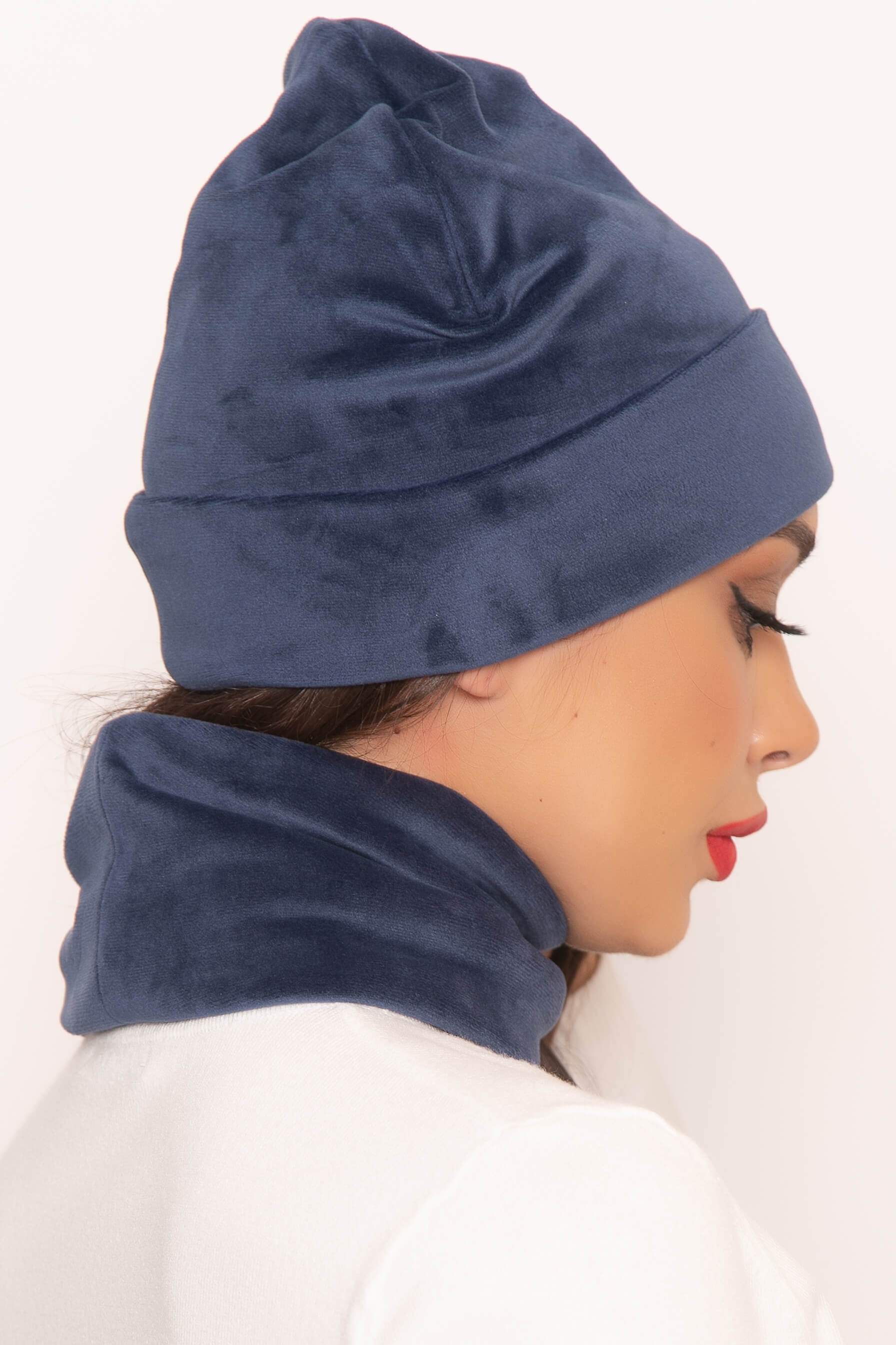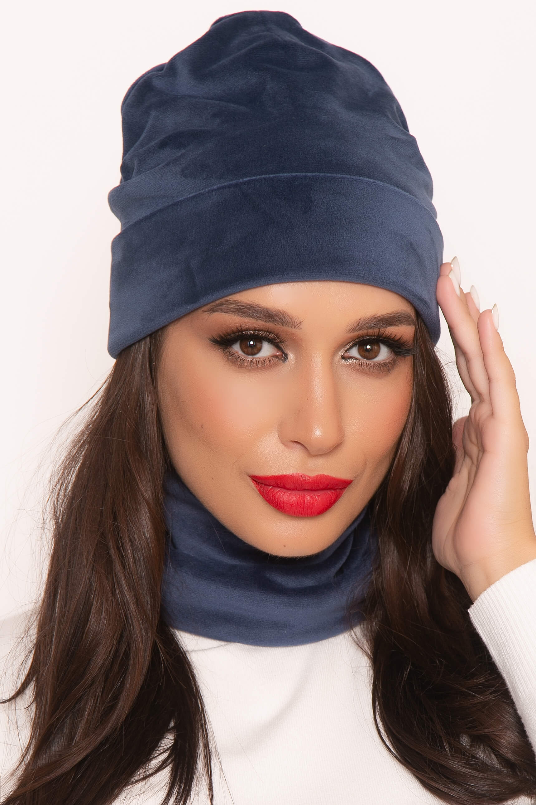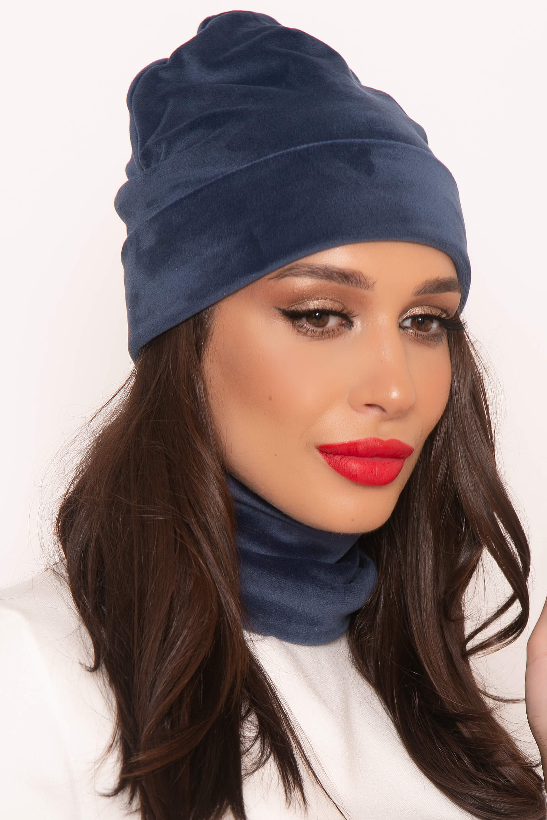 Стильная велюровая шапка согреет Вас в прохладную пору. Шапка имеет универсальную форму и подходит для любой формы лица. Можно носить с отгибкой и без.