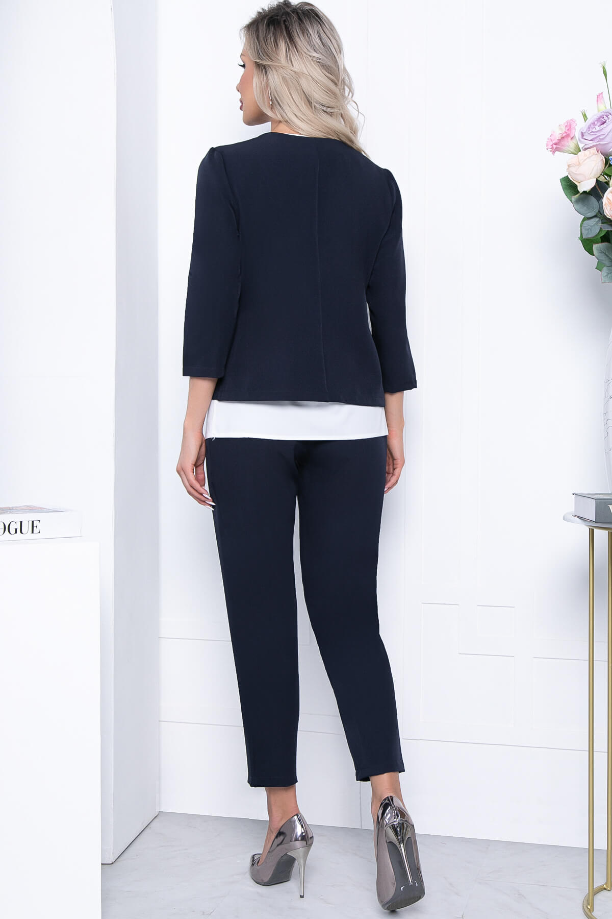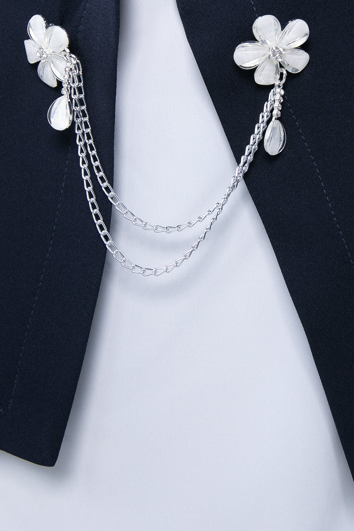 Элегантный классический образ подходит женщинам в любом возрасте и уместен практически в любой ситуации. Костюм из трёх предметов, украшенный брошью - это полностью готовый образ, который выгодно представит Вас даже на светском мероприятии, а роскошный синий цвет подчеркнёт утончённый вкус его обладательницы. Топ с округлым вырезом, плечи закрыты, по бокам небольшие разрезы. Жакет прилегающего силуэта, перед жакета с разрезами, декорирован брошью с серебряной цепочкой. Классические брюки прямого кроя, талия на резинке, комфортны в носке, универсальная длина.