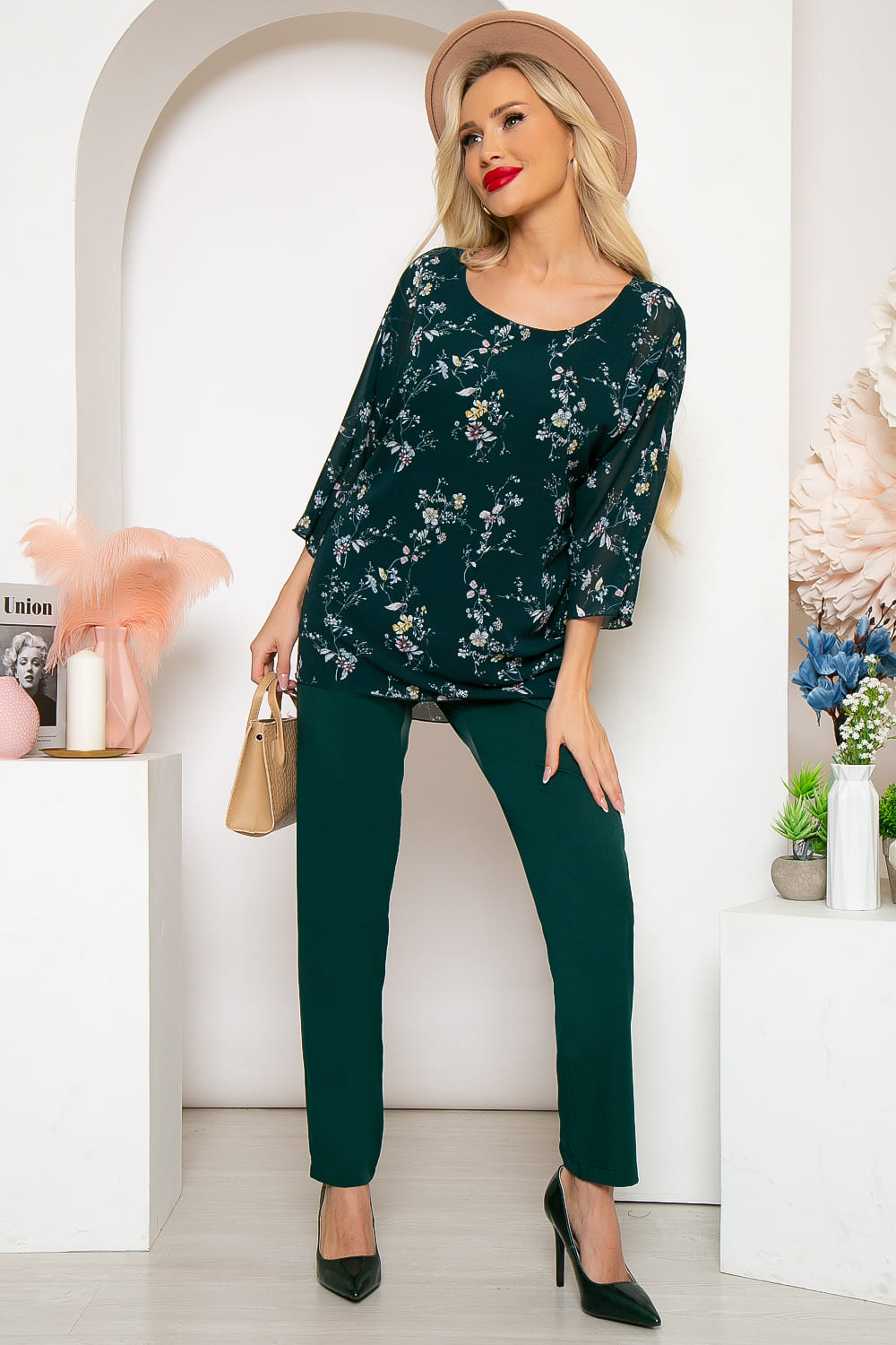 Невероятно женственный костюм, состоящий из двух предметов: прямых брюк на резинке и блузы. Блуза свободного кроя на подкладке, спинка удлинена. Мягкий, округлый вырез горловины, рукав цельнокроенный, три четверти. В комплекте пояс из основной ткани.
