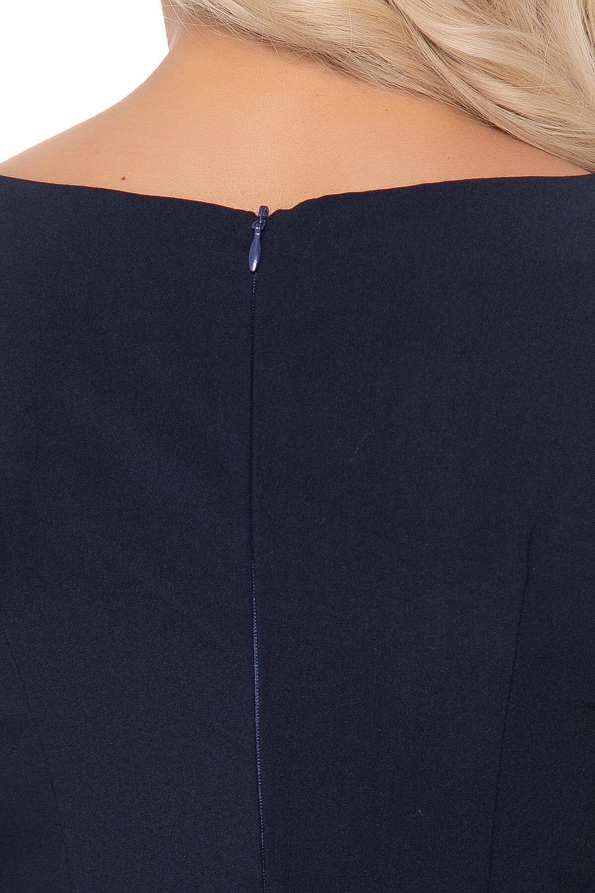Элегантное платье-футляр с воланом в глубоком синем оттенке. Платье прилегающего силуэта способно преобразить любой образ. Платье без рукава. По переду и спинке вертикальные вытачки, которые гарантируют прилегание и идеальную посадку по фигуре.