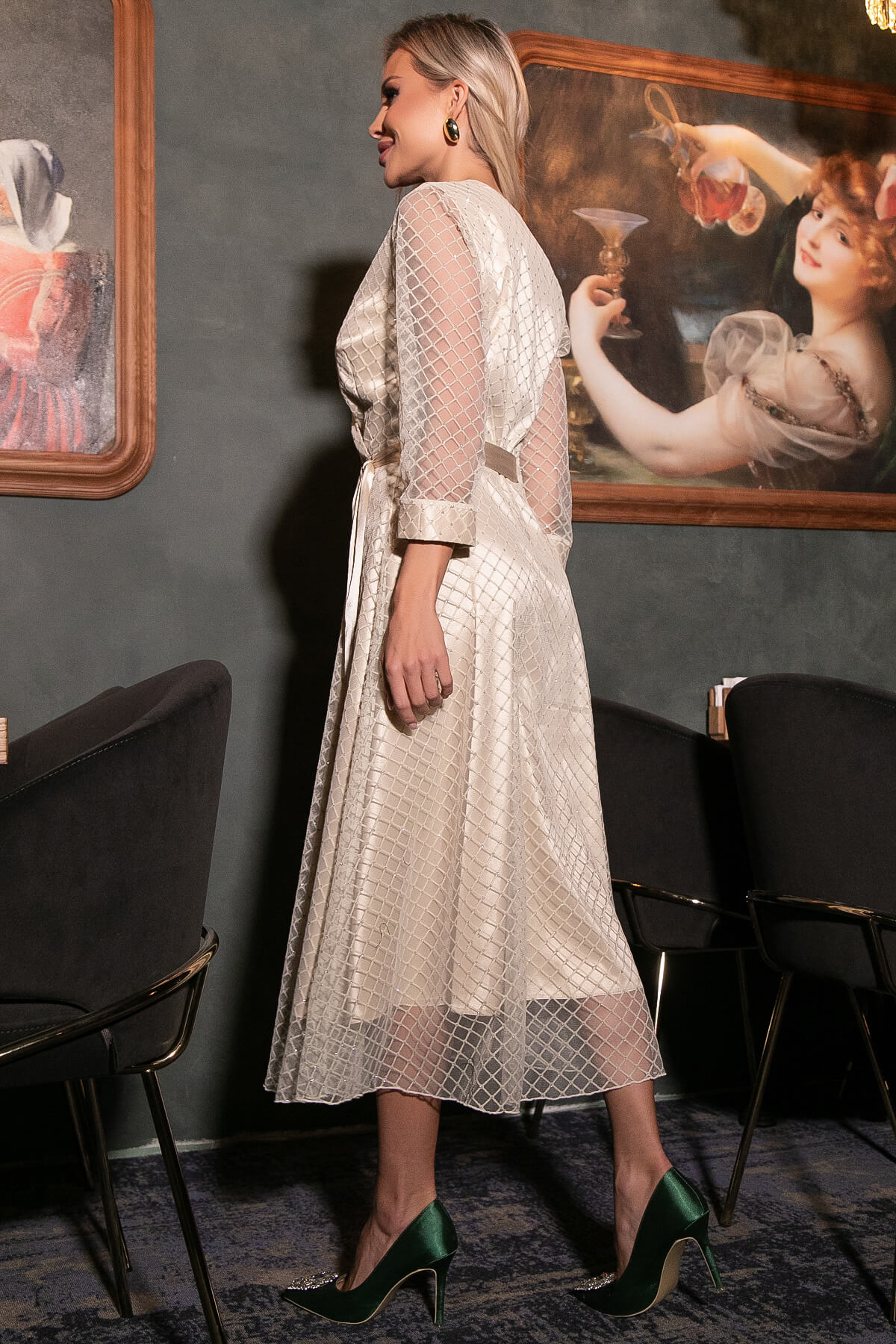 Летящее женственное платье украсит Ваш образ в новогоднюю ночь. Такая модель платья хороша тем, что актуальна на любом празднике, а также выглядит женственно, элегантно и празднично. Платье свободного кроя с длинным рукавом, по низу манжет. Имеет V-образный вырез с имитацией запаха, который подчеркнет вашу зону декольте. Изделие на подкладе. В комплект входит пояс из атласа.