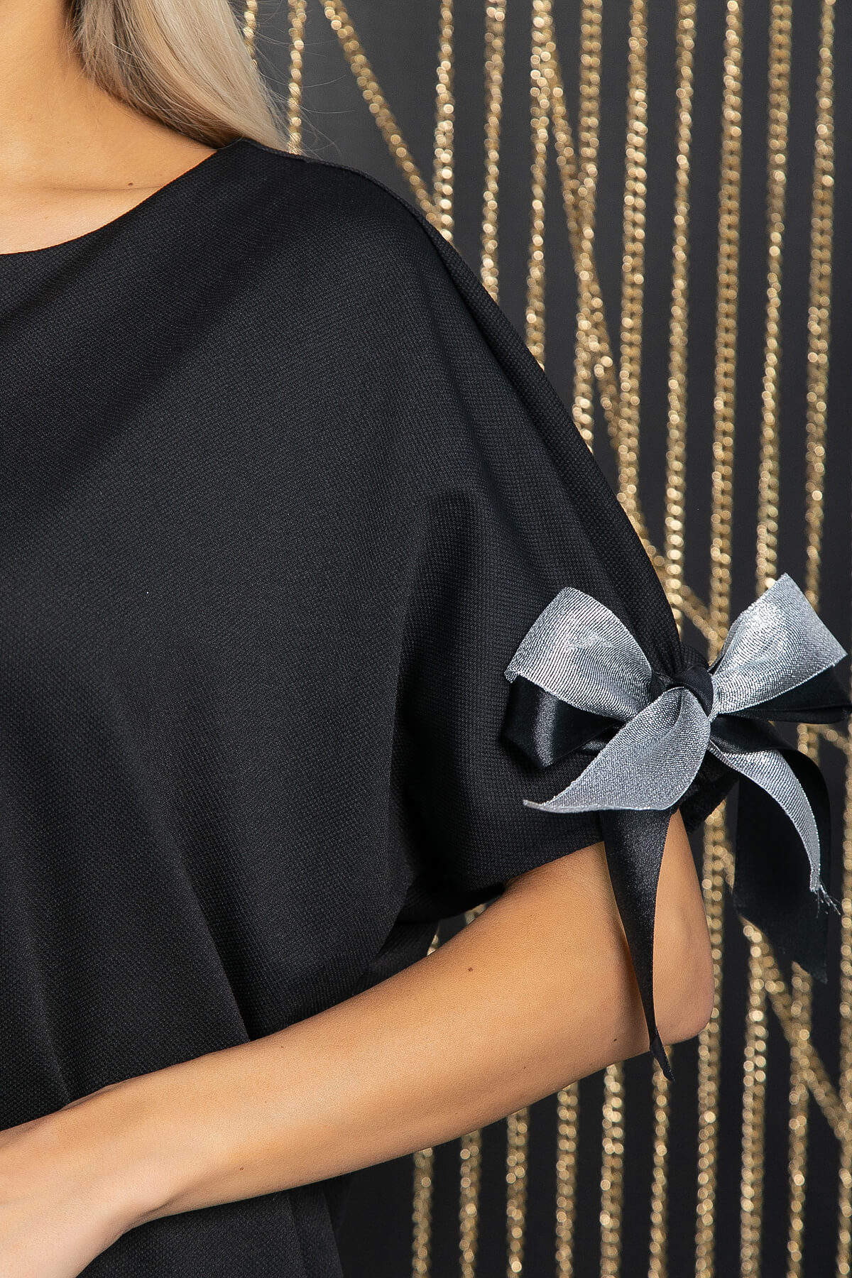 Стильное платье силуэта "бочонок", длиной выше колена, с рукавом три четверти. Рукава у платья украшена красивым бантом. Такое платье универсально, ведь оно уместно в совершенно разных ситуациях. Подходит женщинам, девушкам и подросткам с любым ростом, беременным и мамам на выписку, идеально смотрится как на торжественном мероприятии, так и в повседневной жизни благодаря игре аксессуаров.