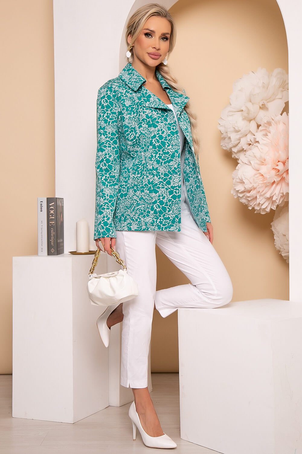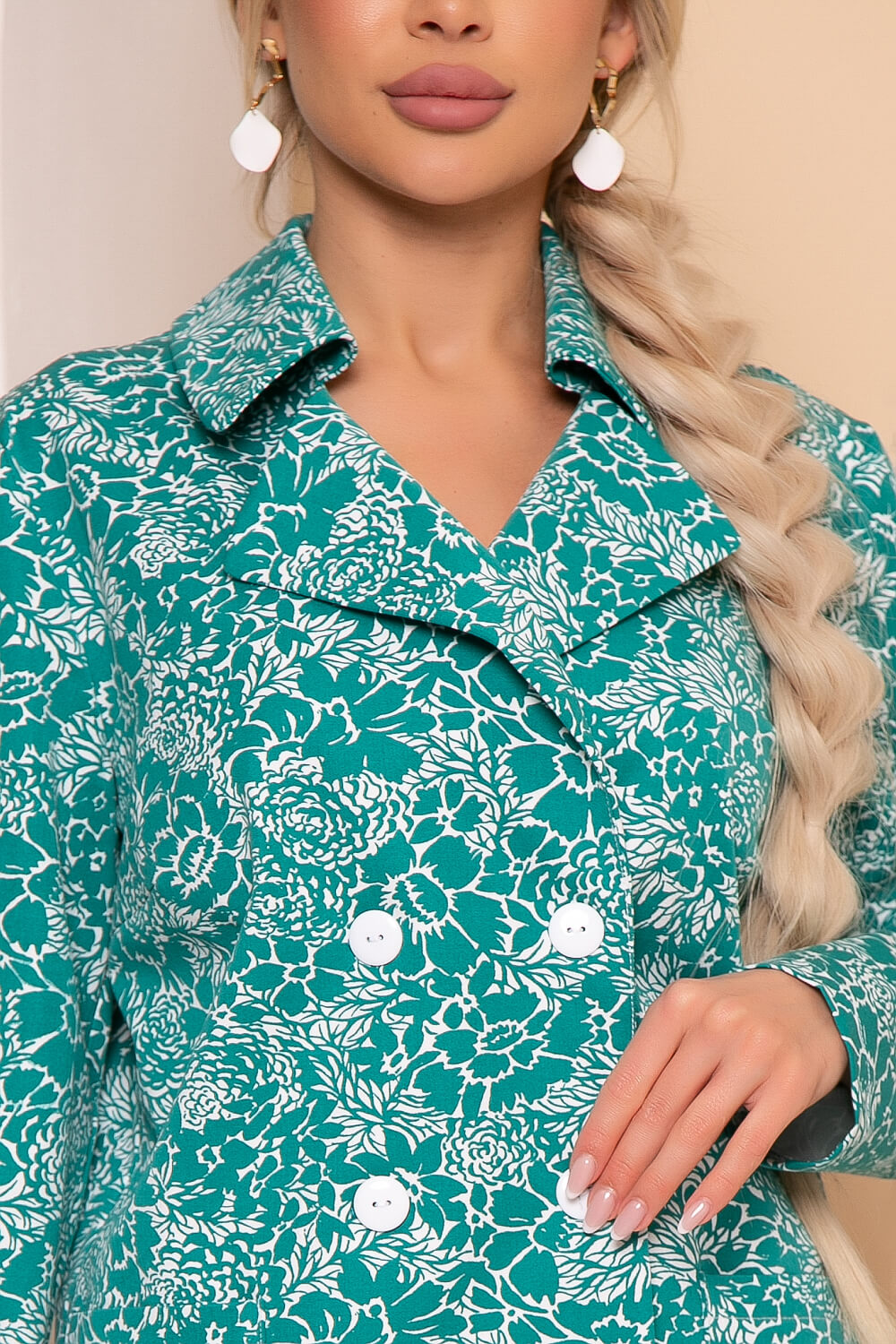 Жакет двубортный из плотной ткани в красивом оттенке с принтом. Удобная и функциональная вещь, которая придает обольстительность образу, корректирует фигуру и подчеркивает лучшие стороны внешности. Лёгкий, комфортный и элегантный жакет прекрасно впишется в Ваш повседневный образ. Рукав втачной, длинный. Горловина оформлена английским воротником. Жакет застёгивается по переду на пуговицы, в комплекте пояс из основной ткани с пластиковой пряжкой белого цвета.